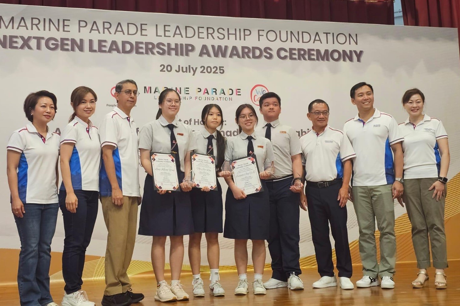 Four of our students were each conferred an award certificate and plaque by the Marine Parade Leadership Foundation on 20 July 2025. This award is presented to those who had demonstrated leadership and service to the community in the past year; and the certificates were signed by Mr Seah Kian Peng, Speaker of the Singapore Parliament. The student recipients are Ling Kheng Ying, Ng Jia Wei, Jasavelle Ang and Lian Kai Jun Kenji who are all from the graduating cohort of 2024.