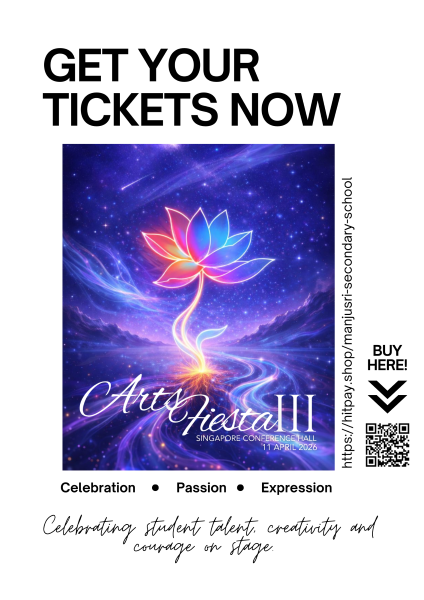 Manjusri Secondary School warmly invites parents, alumni and our other stakeholders to Arts Fiesta III. It promises to be an afternoon of captivating entertainment as we showcase our student talent in music, song, dance and martial arts performance. The details are: